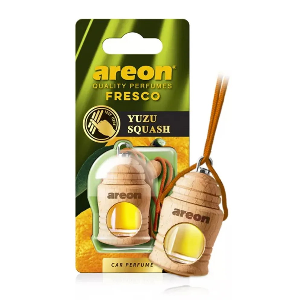 Aromatizador Fresco Areon líquido en barrilito de madera para colgar, muy seguro y eficiente. El perfume se traspasa a la madera gradualmente haciéndose sentir uniformemente en todo el automóvil.
